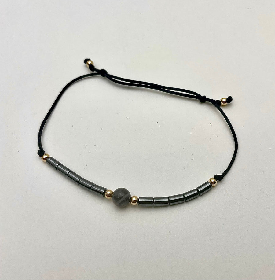 Crafted for daily use, this bracelet boasts durable materials and a sleek design that will surely catch the eye of others while remaining inconspicuous to the wearer. Fashioned with 3mm Slate beads 14kt gold beads on a robust 1mm Nylon double strand cord, this bracelet is built to withstand any and every occasion.